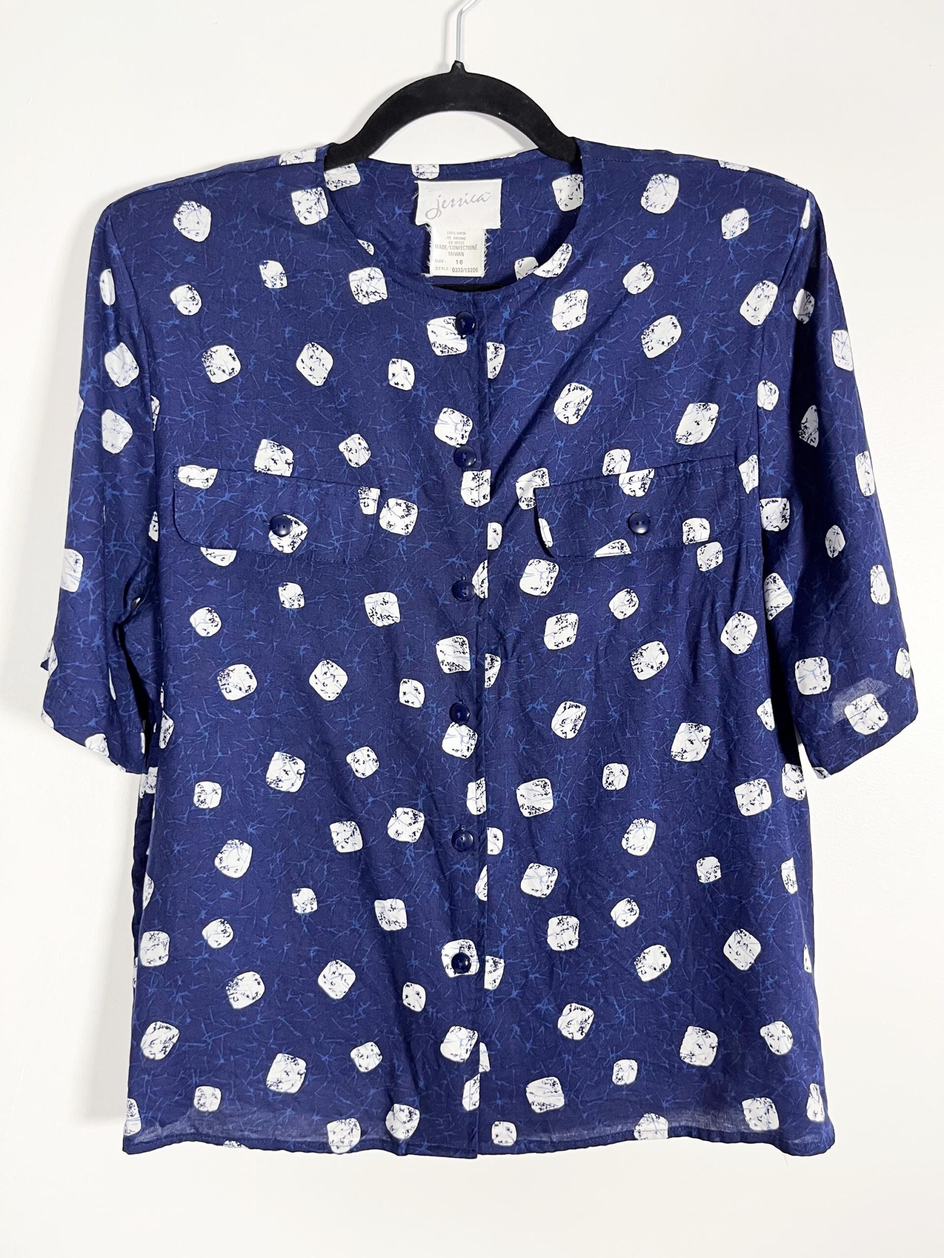 DESIGN – Vintage Jessica blouse in navy blue with white square polka dots in an abstract pattern. Button up with front pockets. Shoulder pads. Flowy and slightly sheer.